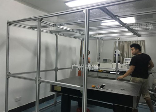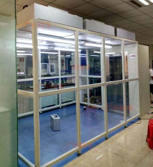 千級潔凈棚產品既可懸掛,又可地面支撐,結構緊湊,使用方便??梢詥蝹€使用,也可多個連接組成帶狀潔凈區域。千級潔凈棚(簡易無塵室)是一種可提供局部高潔凈環境的空氣凈化設備。千級潔凈棚(簡易無塵室)(CLEAN BOOTH)是為最快速方便建立的一座簡易潔凈室,潔凈棚具備多種潔凈等級及空間搭配可以根據使用需求設計制作,因此其簡便運用彈性大安裝容易且施工期短以及可移性為其主要特點,潔凈棚同時可針對在一般等級的潔凈室中局部地區需要高潔凈度的地方做局部增設以降低成本。千級潔凈棚制作現場圖千級潔凈棚(1000級潔凈棚)采用工業鋁材(或不銹鋼方通、鐵方通噴塑)作為框架,風機濾網機組(FFU)送風,四周懸掛防靜電垂簾(或鋼化玻璃),其內部凈化級別可達到100級-10000級。適用于操作區內局部凈化級別要求高的區域。