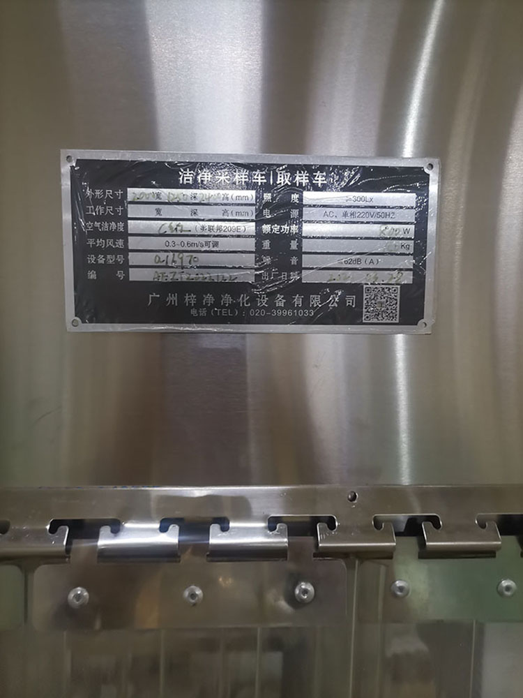 5、工作區兩側為不銹鋼擋板,前后為條形防靜電防塵垂簾,達到理想防塵效果。“梓凈”牌防爆潔凈采樣車名牌6、配一臺大風量低噪聲進口風機0.165KW,確保風速大于0.45m/s;