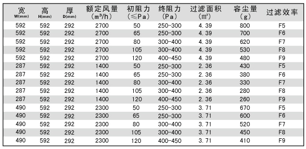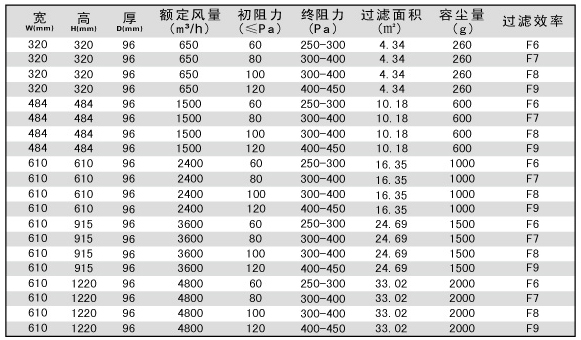 效率:大氣塵比色法平均過濾效率:45%,65%,85%,95