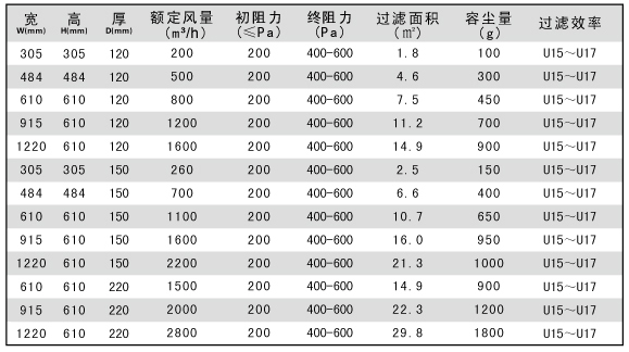 用戶選購(gòu)指南-U15-U16無隔板超高效過濾器技術(shù)參數(shù)
